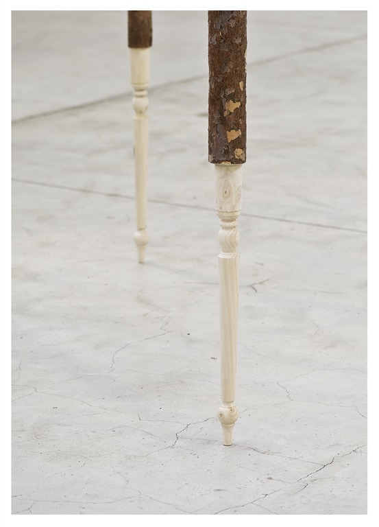 Each tree is caught in a transitory state of metamorphosis, half carved between what it was and what it will become, the stripped tree tops balancing upon identikit table legs. The juxtaposition of the raw natural elements of the tree with the carefully carved table legs demonstrates Mackie’s continuing interest in the interconnectivity of the traditionally opposed ideas of ‘wild’ and ‘civilised.’ Thetrees act as a metaphor of mankind’s evolution from atavistic primates to our contemporary consumer driven society. As Coline Milliard notes in the catalogues opening essay, the placement of the trees within the gallery further mimics society’s own incorporation of the tamed wild into the city space. It is through this reconciliation of both formal and conceptual elements that Mackie successfully forces the spectator to question their own understanding of what it means to be civilised.