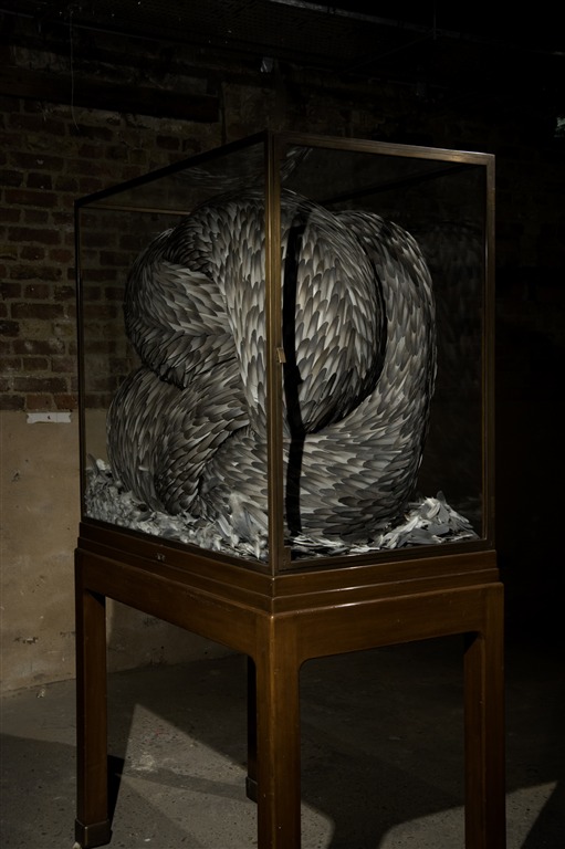 Tom Gallant has taken inspiration from weaver birds. He has used shreds of interior magazines to create nests that emerge from the mahogany panelled cabinets in the Octagon Room.