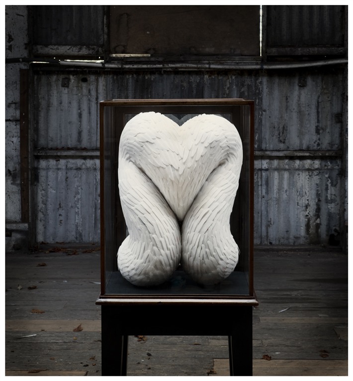 MccGwire’s avian structures appear rooted in the aesthetic of natural history, taking on its associations of intellectual dominance, decadence and display. The pieces adopt the qualities of their material – appropriating the abject signification of bird feathers to create hybrids. Lifeless wings seem poised to take flight yet remain tethered, their momentum restrained, giving the sculptures a seething, serpentine quality. The culture of display is also key to the works, exploiting the perverse attraction to possess the abject and unfamiliar creature, and to frame it within a culture driven by aesthetic hierarchy. As MccGwire describes her pieces, they represent something ‘both sensual and deviant in equal measure’.