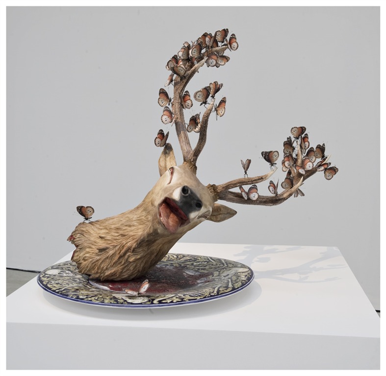 Regeneration contemplates the possibility of change through rebirth, rediscovery and reappropriation, manipulating earth into elegant and fragile structures. In one piece, a cluster of butterflies flock to raise the severed head of a deer from an ornamental platter, recalling the Renaissance representations of John the Baptist or Holofernes. In a similar echo of classical scenes, and dominating the Regeneration is the serene image of a silverback gorilla resting in the Buddhist lotus position on a bed of discarded mattresses. A roe deer lies prone across its body, while wrens and goldcrests commune around the pair. The piece is an evocation of symbolic power, from the visceral confrontation of our Darwinian descendent dying out in front of our eyes, to the shift between the viewer and sculpture, object and subject as we find ourselves caught in the compassionate gaze of the animals. Our own mortality is inscribed in the tableaux where urban structures, religion and the animal world collide to reveal the grace in disgrace which Bertozzi and Casoni seek to capture.